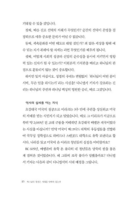 기독청년들은 결코 자기 개인의 인생 문제에만 몰입하지 않습니다. 국가와 민족, 인류 공동체 문제에도 영적 통찰력을 갖기 원합니다. 국내 정치의 발전, 남북 평화통일, 미국이나 중국과의 바른 관계 설정, 이라크 전쟁 등, 21세기 세계와 역사 문제에 대해 바른 견해와 해결책을 구합니다. 그것이 촛불 시위로 표현되기도 하고, 네티즌의 열띤 공방으로 표출되기도 합니다. 하지만 하나님의 초자연적 지혜 없이 세계 역사에 대해 연구하면 할수록 우리는 불가지론에 빠질 수밖에 없습니다. 세계와 우주의 주재이신 하나님의 말씀 없이는 과거와 현재, 미래를 넘나들며 세계 역사를 밝히 보는 비전을 소유할 길이 없습니다(삼상 3:1 참조). 역사의 강물은 어디를 향해 흘러가고 있습니까? 교회와 인류의 운명은 어떠합니까? 다니엘서는 분명하게, “세계와 역사를 주관하시는 절대자는 하나님이시다!”라는 초월적 진리를 선포합니다.