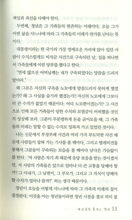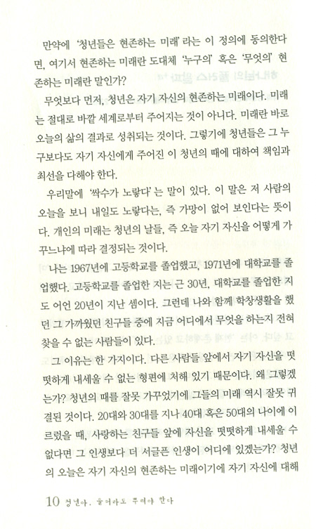 청년 시절은 반드시 사라져 없어진다. 동시에 청년 시절은 어김없이 자신의 삶 속에 농축되어 남는 법이다. 그러므로 청년 시절의 중요성은 아무리 강조해도 지나침이 없을 것이다. 청년의 때란 자기 가능성의 그릇을 가장 크게 키울 수 있는 두 번 다시 되풀이되지 않는 절대적 시기이기 때문이다.