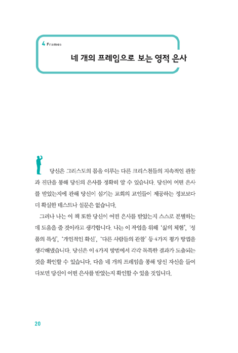 이 책에서 그는 영적 은사를 진단할 수 있는 ‘4가지 프레임 - 체험, 특성, 확신, 관찰’을 제시하는데, 이 프레임은 각 사람의 은사를 적확히 도출해내기 위한 4가지 검사를 가리킨다. ‘자가 진단 검사’3가지 외에 ‘가까운 지체로부터 점검 받는 검사’가 포함되어 있다. 기존의 은사 발견 테스트 대부분이 셀프 테스트에 그쳤다면, 다른 성도나 교역자의 관찰을 통해 은사 진단을 받도록 구성되어 있다는 것이 이 책의 괄목할 만한 점이다.