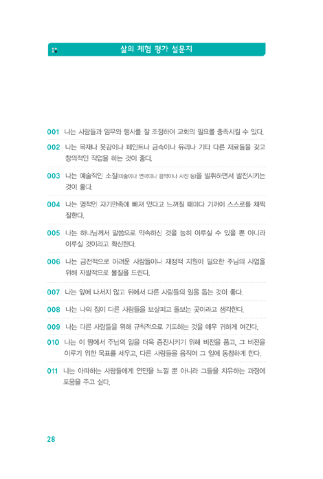 당신의 특별한 성품과 영적 은사 사이에는 상관관계가 있습니다. 이번 검사는 당신의 고유한 성품과 기질과 행위의 특징을 분석함으로써 당신이 어떤 은사를 받았는지 도출해내는 평가입니다. _p 44