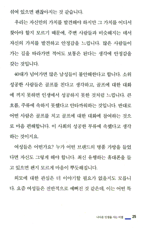 이 책은 진정으로 자기 자신다운 삶, 일등주의 아닌 진정한 경쟁력을 갖춘 삶을 살 수 있는 비결이 있다고 말합니다.