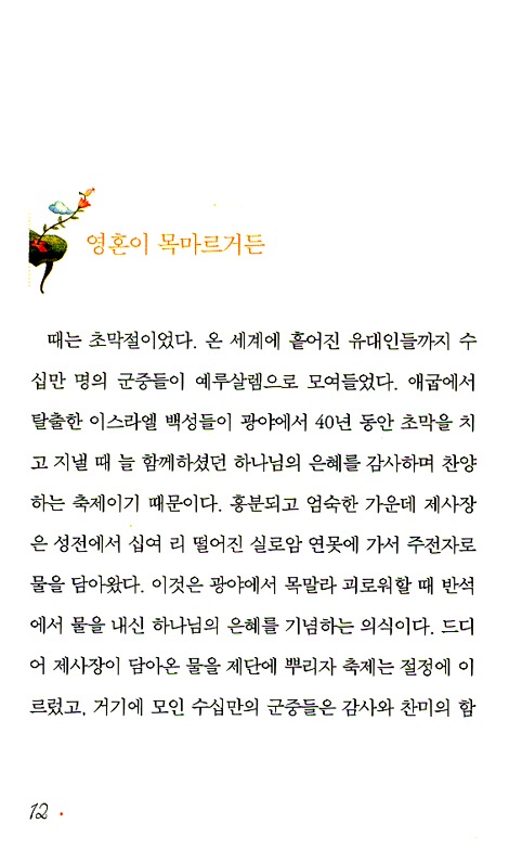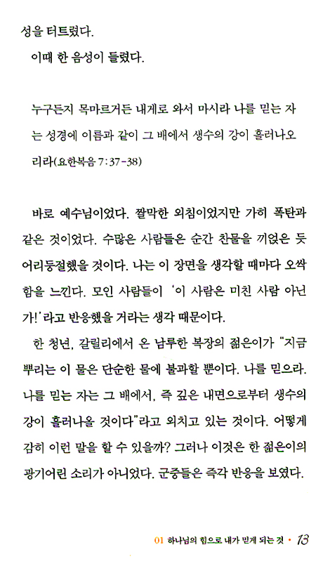 나는 예수님을 믿는 자에게 하나님의 자녀가 되는 권세를 주셨다는 말씀에서 완전히 뒤집어졌다. 왜냐하면 지금까지 하나님을 믿는 것에 대해 굴레라고 생각했기 때문이다. 그래서 하나님을 부인하지도 못하고 즐거워하지도 못했던 것이다. 하나님의 자녀가 되는 것은 굴레나 억압이 아니라 하나님께서 주시는 권세이며 특권이었다. 세상 그 누구도 주지 못하는 것이다. 이것이 얼마나 큰 영광이며 은혜인지를 깨닫게 되었다. ∷ 112쪽, “하나님의 손이 내 영혼을 붙잡는 것” 중에서