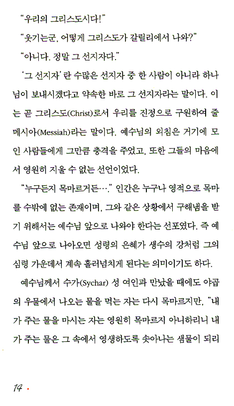 이 책은 새신자들이 참 신앙인으로 살아가기 위해 말씀에 귀 기울이고 따라가도록 조언하고 있다. 그리고 세상 것으로는 채울 수 없는 영적 목마름을 예수님 앞으로 나아와 예수 그리스도를 마시도록 인도한다. 그리하여 예수 그리스도를 고백하고 믿는다고 시인하는 것뿐만 아니라 주님과 함께 교제하는 삶이 계속적으로 이루어질 때 우리 속에서 생수의 강이 흐르고 날마다 샘솟는 은혜를 누리게 될 것이라고 말하고 있다.