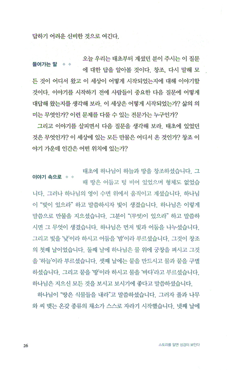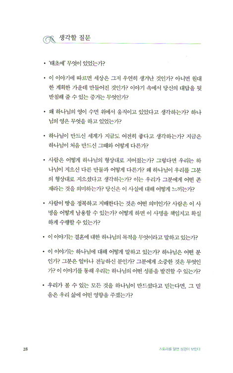 하나님은 우리에게 안내 책자나 신앙 교과서를 주신 게 아니라 하나님을 직접 경험한 사람들의 이야기를 모아 엮은 책을 주셨다. 그것은 사람이 이야기를 통해 가장 자연스럽게 배우는 존재이기 때문이다. 의사소통을 편리하게 만드는 첨단 기기 속에서도 전 세계 인구의 3분의 2는 여전히 구두로 의사를 전달하는 학습 방법을 선호한다는 사실이 그것을 증명한다.