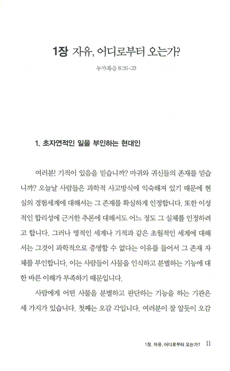 첫 번째 설교 “자유, 어디로부터 오는가?”에서는 사단과 귀신에 결박된 거라사 광인의 모습을 통해서 세상의 정신에 매여 있는 사람들의 실상을 적절하게 보여주면서, 예수님을 구주로 영접하는 것만이 진정한 자유를 찾는 길임을 보여준다.