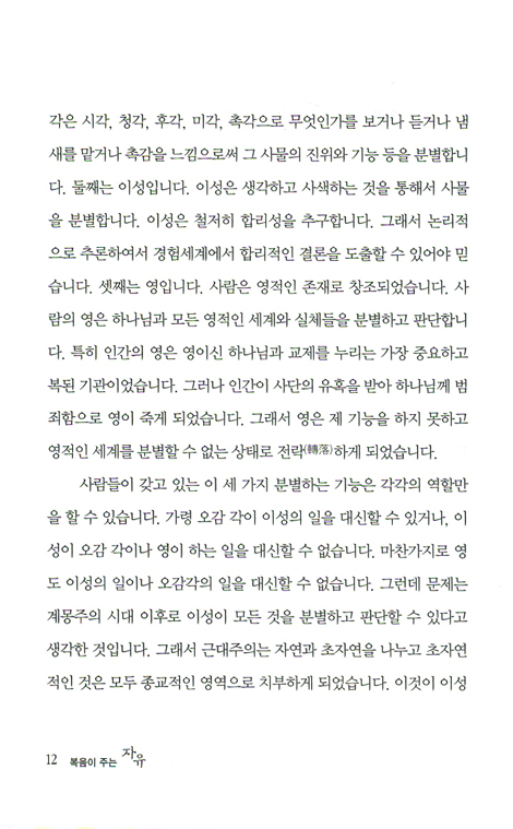 노천상 목사의 ‘복음이 주는 자유’는 바로 이러한 목적으로 집필되었다. 가정 먼저는 이웃에 사는 이들에게 복음을 소개하되, 기복적이거나 종교적 편향이 아니면서도 죄 있는 인생이 복음을 통해 비로소 자유를 얻게 되는 핵심적 내용을 아주 편하게 제시하고 있다. 아울러 새신자에게도 왜 자신이 이 복음 안에 거해야 하는가를 재빨리 가름할 수 있도록 돕고 있다.