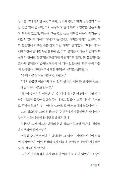 생전에 그와 1년여간 교제했던 안이숙 여사는 주기철 목사를 가리켜 흡사 예수 그리스도의 용모를 그대로 보는 것 같았다고 증언했습니다. 그랬던 그가 신사참배를 반대했다는 이유로 일본 경찰들에게 잔혹한 고문을 받다가 감옥에서 숨졌습니다. 아무쪼록 이 책을 통해 그의 일생을 더듬어보면서, 그가 우리에게 유산으로 남긴 위대한 신앙 정신을 물려받을 수 있기를 바랍니다.