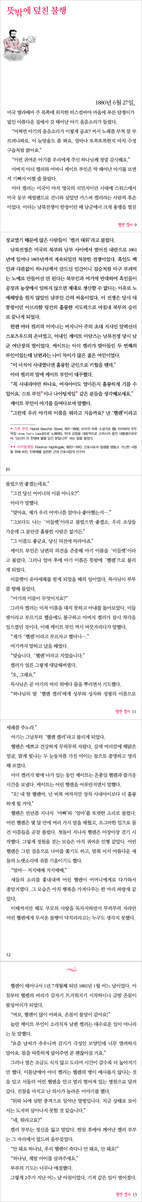이처럼 헬렌 켈러는 하나님께서 주신 가장 큰 고난의 짐을 기쁨으로 짊어졌던 사람이었고, 그 고난을 통하여 예수 그리스도의 사랑을 몸으로 배워 그대로 실천했던 사람이었다. 불가능을 가능으로 바꾼 헬렌 켈러의 위대한 정신과 하나님을 사랑하고 자신과 같이 연약한 이웃을 사랑하는 마음이 이 책을 읽는 청소년들에게도 꼭 전해지기를 바란다.