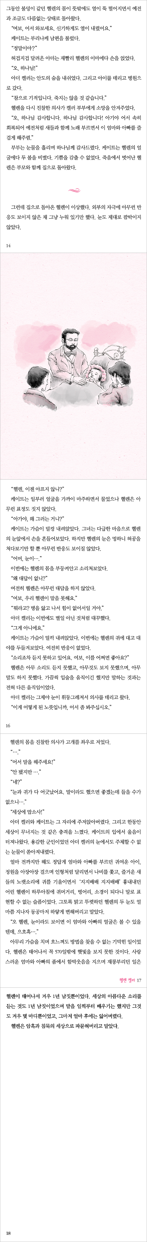 ![]() | 생후 2년도 되지 않아 급성 열병으로 시각과 청각을 상실하면서 말까지 못하게 되는 삼중고(三重苦)를 겪었으나 이 모든 장애를 이겨냈다. 거기에는 헬렌을 일곱 살 때부터 하나님의 사랑과 헌신으로 가르친 설리번 선생님의 헌신적인 노력이 있었다. 헬렌 켈러는 소망의 하나님을 바라보며 꾸준히 노력한 결과 발성법을 배워 말을 할 수 있게 되었고, 왕성한 호기심과 지식에 대한 열정으로 명문 대학을 우수한 성적으로 졸업했다. 이에 그치지 않고 그녀는 자신처럼 장애를 가진 이들의 복지를 위해 평생을 바쳤다. 또한 여성과 인종차별을 당하는 흑인, 착취당하는 노동자들 같은 약자(弱者)들을 위한 대변인으로서 전 세계를 다니며 수많은 연설을 했다. 그녀가 맑은 영혼과 올바른 양심으로 집필한 책들은 아직도 세계인을 감동시키고 있다. 대표적으로 그녀가 스물세 살 때 쓴 《나의 생애》는 뉴욕공립도서관이 선정한 ‘20세기 가장 중요한 책 100권’에 포함되었으며, 쉰세 살에 쓴 《사흘만 볼 수 있다면》은 20세기 최고의 수필로 평가받고 있다. 그녀는 여성 최초로 하버드 대학 명예 학위를 받았고, 미국 최고 훈장인 ‘자유의 메달’을 수상했으며, 생전에 전미 여성 명예의 전당에 이름을 올렸다. |