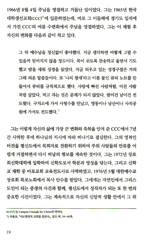 "그 뒤 예수님을 정신없이 좋아했다. 지금 생각하면 어떻게 그럴 수 있을까 믿어지지 않을 정도이다. 목이 쉬도록 찬송하고 울면서 기도했고 밤을 새워 성경을 읽었다. 지금 외우고 있는 성경구절은 거의 그때 외운 말씀들이다. 또 ‘나의 팡세’라고 이름 붙인 큐티 노트를 만들어서 큐티를 규칙적으로 했다. 사랑에 빠진 사람처럼, 미친 사람처럼 살았다. 먹고 자는 것은 문제가 되지 않았다. 밤이건 낮이건 전도했다. 구치소에 가서 사형수를 만났고, 명동이나 남산이나 사직공원에 가서도 전도했다."