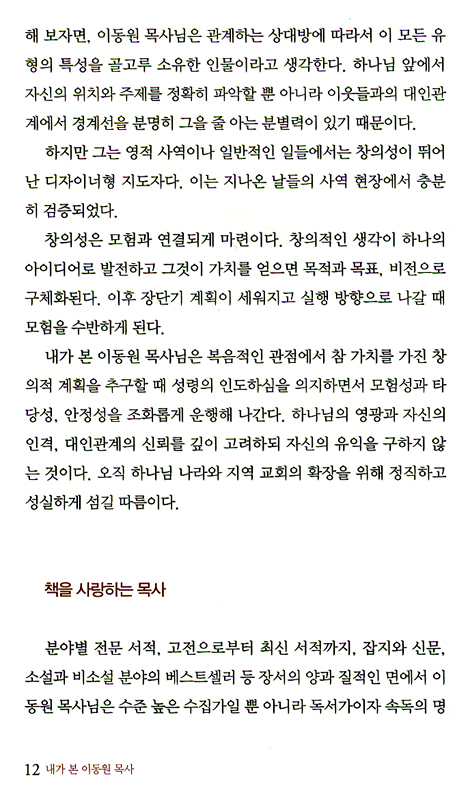 이 목사님은 처음 뵈었을 때보다 지금이 더 좋은 분이다. 멀리서 뵐 때보다 정작 가까이 뵈었을 때가 더 좋은 분이다. 정말 이 목사님은 내게 그런 분이다. 나뿐만 아니라 모든 사람들에게 그런 분이라고 나는 생각한다. 한결같기만 하여도 훌륭한데 이 목사님은 그 한결같음을 넘어서는 분 같다.