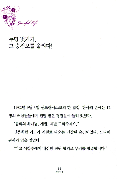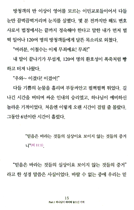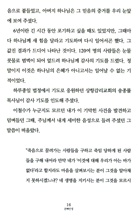 하루 종일 법정에서 기도로 응원하던 상항감리교회의 송종률 목사님이 감사 기도를 인도해 주셨다. 이철수가 누군지도 모르던 내가 이 기막힌 사건을 발견하고 덤벼들던 그때, 주님께서 내게 세미한 음성으로 들려 주셨던 그 말씀이 떠올랐다.