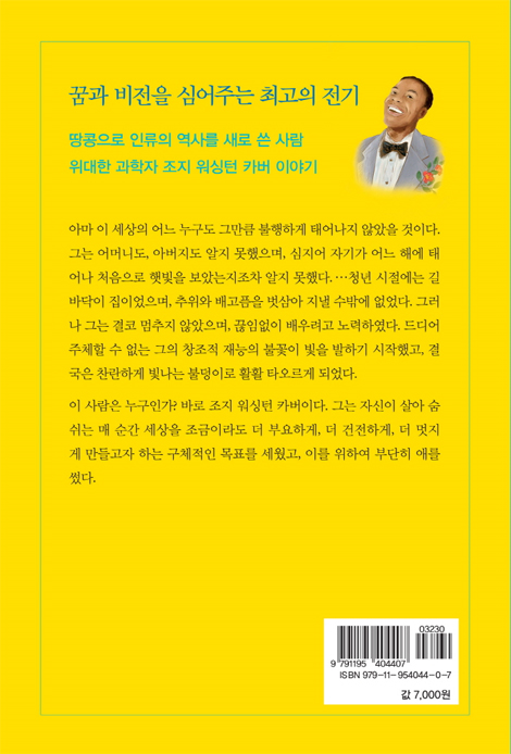 가장 불행하게 태어나서 가장 존경받는 과학자가 된 조지 워싱턴 카버의 이야기는 현재 크고 작은 어려움을 겪고 있는 독자들에게 큰 위로와 기쁨을 선사할 것이다. 재미와 의미와 감동을 모두 갖춘 이 책은 특히 청소년들에게 주어진 삶에 감사하는 마음과 더불어, 꿈, 희망, 도전, 용기 등 삶의 귀중한 가치들을 심어줄 것이다.