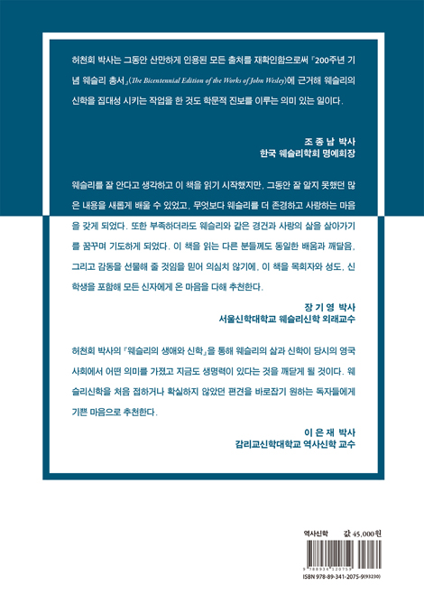 허천회 박사의 『웨슬리의 생애와 신학』을 통해 웨슬리의 삶과 신학이 당시의 영국 사회에서 어떤 의미를 가졌고 지금도 생명력이 있다는 것을 깨닫게 될 것이다. 웨슬리신학을 처음 접하거나 확실하지 않았던 편견을 바로잡기 원하는 독자들에게 기쁜 마음으로 권면한다.