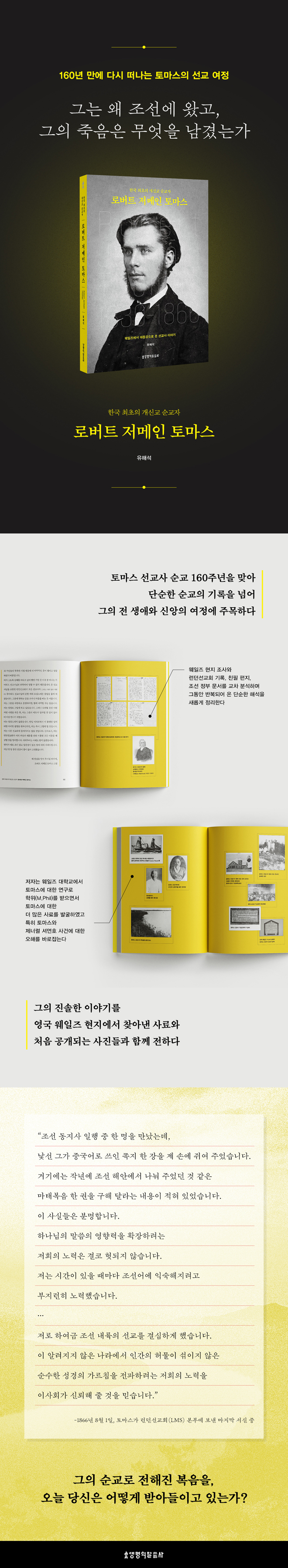 2026년은 로버트 저메인 토마스가 대동강변에서 생을 마친 지 160주년이 되는 해다. 그는 오랫동안 ‘한국 최초의 개신교 순교자’라는 이름으로 기억되어 왔다. 그러나 이 책은 그의 죽음이 아니라, 그 죽음에 이르기까지의 삶에 먼저 주목한다.
