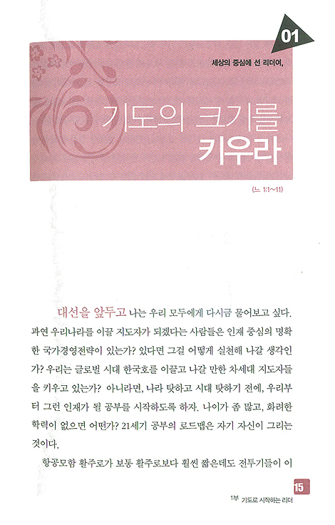 새벽은 기가 막히게 아름다운 것이며, 온 세상을 밝게하는 좋은 소식이지만 새벽 직전엔 어둠이 짙다. 한 시대가 답답하고 어두울 때 모두들 역사의 새벽을 기다리지만 그것은 그냥 오지 않는다. 하나님의 부르심을 받은 지도자에 의해서 준비되어야 한다. 새벽을 준비하는 지도자란 어떤 사람인가?