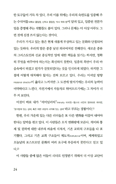 이 책은 미셔널 탐구, 즉 한 사람의 그리스도인이 된다는 것이 의미하는 핵심으로 되돌아가고자 탐구하는 교회 리더들이 직면한 도전에 관한 책이다. 지난 10여 년 동안 내가 배운 것은, 지금과 같은 격변의 시기에 ‘우리가 어떻게 인도할 것인가.’라는 실질적인 쟁점에 주목하지 않는다면 미셔널 과제들은 결코 뿌리를 내릴 수도, 번영할 수도 없다는 사실이다.