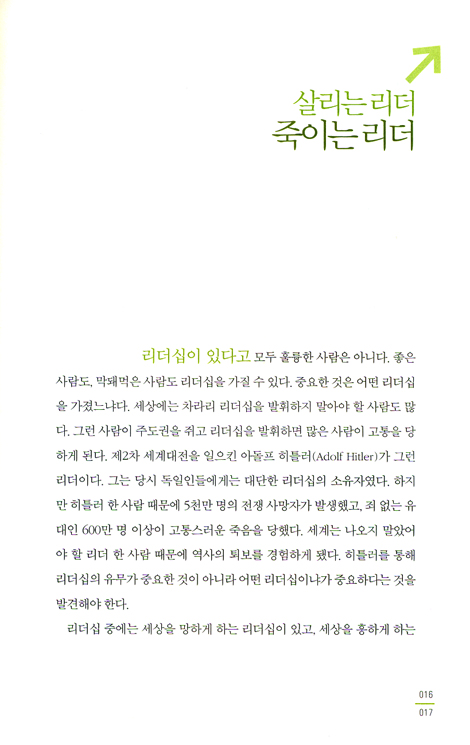 *어떤 지도자들은 시키는 데 익숙하다. 지시하는 것으로 모든 일을 처리해 나간다. 그러나 진정한 지도자는 먼저 자신에게 지시하고, 그 이후에 사람들이 따르도록 한다. 승리하는 군대의 리더는 전장의 맨 앞에서 ‘나를 따르라.’고 외친다. 그러나 패배하는 군대의 리더는 맨 뒤에서 ‘돌격 앞으로’만을 외칠 뿐이다. (p.96)