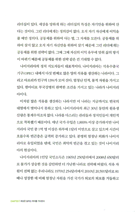 나이지리아를 생각하면 가장 먼저 떠오르는 것이 빈곤, 약탈, 살인, 테러일 것이다. 하지만 아이러닉하게도 나이지리아는 석유수출국 내에서 다섯 번째로 석유량이 많은 나라, 그야말로 부국강병의 조건을 갖춘 나라이다. 그런 나라가 왜 빈곤에 허덕이고, 남의 것을 약탈하는 죄를 범하고 있는가? 이는 나라를 갉아먹고 있는 정치 지도자들, 즉 리더라고 불리는 사람들 때문이다. 그들은 리더의 자리를 자신만을 위한 자리로 생각했다. 그 결과 많은 자원이 있음에도 불구하고 나라가 몰락하고 말았다. 이들은 진정한 리더가 아니다. 강압적이고 독단적인 소위 어둠의 세상에 존재하는 보스와 다를 바가 없다.