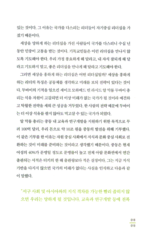 *오직 공동체를 생각하며, 창조적인 시각으로 미래를 준비하는 리더를 만나는 것은 하나님의 축복이다. 그러나 엄청난 자원을 가지고도 국민의 대부분을 빈민층으로 만드는 리더를 만나는 것은 재앙 중에 재앙이다. 무에서 유를 창조하는 리더가 필요한 시대에, 있는 것도 까먹어 버리는 리더는 모두를 불행하게 할 뿐이다. 사람들은 공동체를 위하여 창조적인 전략을 만들어 내는 미래형 리더를 기대한다. (p.21)
