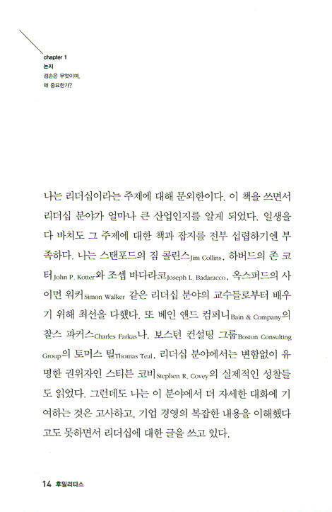 창조리더십과 수평조직이 강조되는 이 시대에 ‘겸손’은 조직원들의 지혜와 창의력을 융합시켜주는 핵심 덕목이다. 《후밀리타스》는 진정한 겸손이야말로 타인에게 지속적인 영향을 끼칠 수 있는 주요 요소임을 친절하게 설명한다. 아직도 수직적 권위가 리더십이라고 착각하는 리더들에게 이 책을 권한다. 겸손의 함양이 리더십의 근본을 바꾸는 열쇠임을 이해하게 될 것이다.