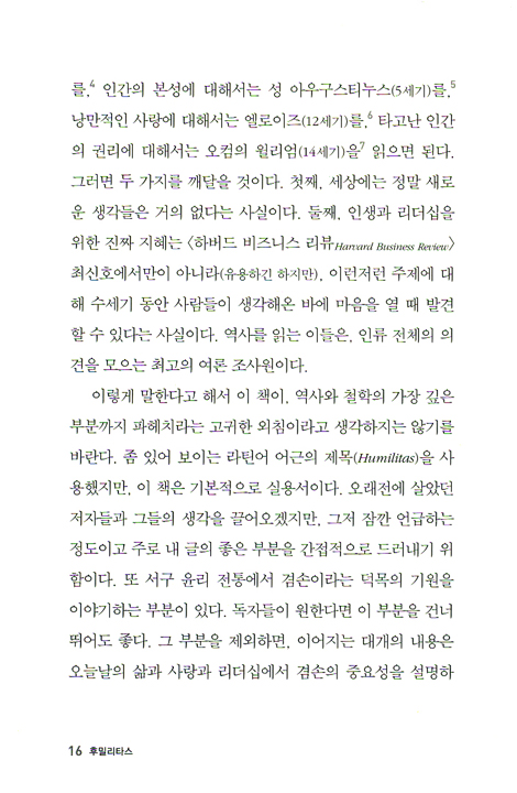 '겸손'을 뜻하는 영어 ‘humility’의 어원인 라틴어 단어 'humilitas'를 제목으로 내세운 이 책 《후밀리타스》에서는 오늘날의 리더들이 그 가치를 쉽게 망각하는 겸손이야말로 위대한 리더십을 완성하는 핵심 요소임을 보여준다. 치열한 경쟁을 통과하고 무슨 수를 써서라도 생존해야 하는 시대에, 이 먼지 앉은 고대의 미덕을 꺼내든 데는 까닭이 있다. '겸손한 사람이 영향력과 감화력이 더 크다'는 진실 때문이다.