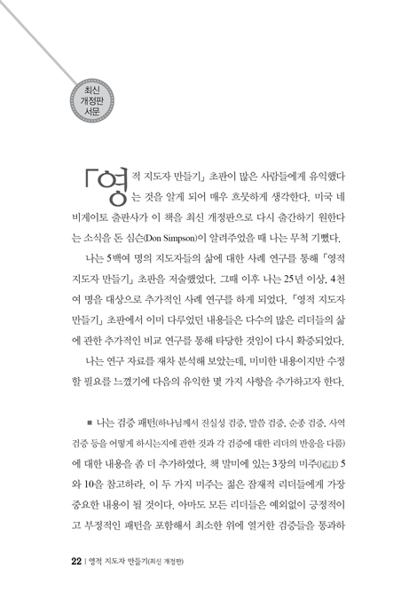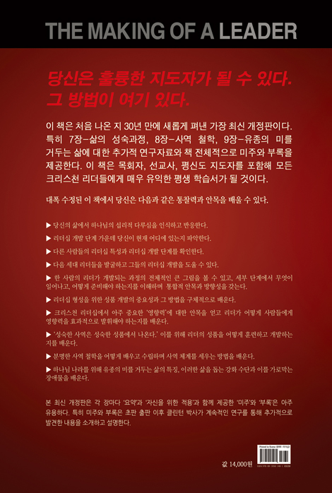크리스천 리더십의 세계적 권위자인 클린턴 박사가 30년만에 다시 쓴 최신 개정판으로, 초판에서는 빠졌던 본문의 중요한 개념과 해설을 제공하는 용어해설, 많고 풍부한 주석들, 참고 부록들과 세 개 장(chapter)에 대한 내용 보강은 독자에게 큰 도움이 될 것이다. 특히 7장 - 삶의 성숙 과정, 8장 - 사역 철학, 9장 - 유종의 미를 거두는 삶에 대한 추가적인 연구자료들은 클린턴 박사가 초판 출판 이후 계속적인 연구를 통해 추가적으로 발견하고 연구한 내용으로서, 모든 크리스천 리더들에게 매우 유익한 평생 학습서가 될 것이다.