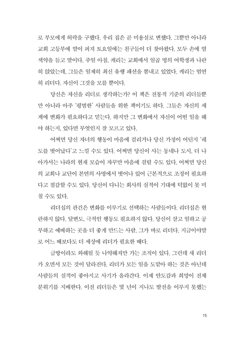 리더십의 관건은 변화를 이루기로 선택하는 사람들이다. 리더십은 현란하지 않다. 달변도, 극적인 행동도 필요하지 않다. 당신이 살고 일하고 공부하고 예배하는 곳을 더 좋게 만드는 사람, 그가 바로 리더다. 지금이야말로 어느 때보다도 더 세상에 리더가 필요한 때다.