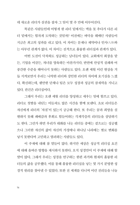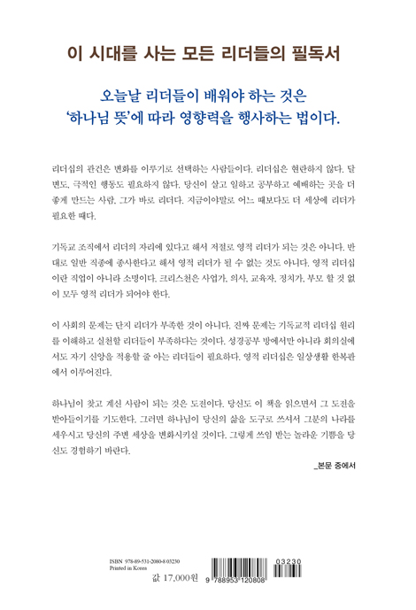이 책은 이런 고민을 안고 있는 리더들, 각 교회 리더들, 사회의 각 영역에서 활발하게 리더의 역할을 감당하고 있는 기업, 공공기관, 각종 단체들의 크리스천 리더들(대표뿐만 아니라 팀장, 과장, 부장 등 모든 기관의 장들), 또 예비 리더들에게 귀한 이정표가 될 것이다.