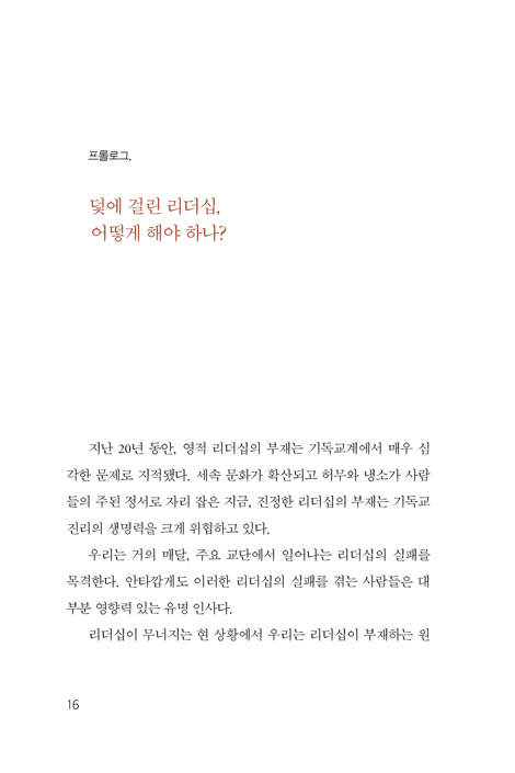 사회는 말할 것도 없고, 기독교 지도자들의 실족과 리더십 실패에 관한 문제가 계속해서 한국 교계의 ‘뜨거운 감자’다. 2000년대 초, 중반 무렵 리더십에 관한 책이 인기리에 쏟아져 나오고, 출판 시장의 수요도 컸던 시절이 있었다. 그래서 이미 리더십에 관해서는 더 이상 새로울 내용이 없다고 치부하는 시선도 많다. 그러나 무색하게도 여전히, 아니 점점 더 한국 사회, 한국 교회 참다운 리더십 부재를 통탄하는 목소리는 거세지고, 거기에 대한 불만과 불안 또한 커지고 있지 않은가. 진정한 치유책을 찾기 위해, 절망보다 더 거대한 절망이 매일같이 밀려오는 이 시대를 돌파하기 위해 이제 우리의 불편한 진실을 마주보고 인정해야만 한다.