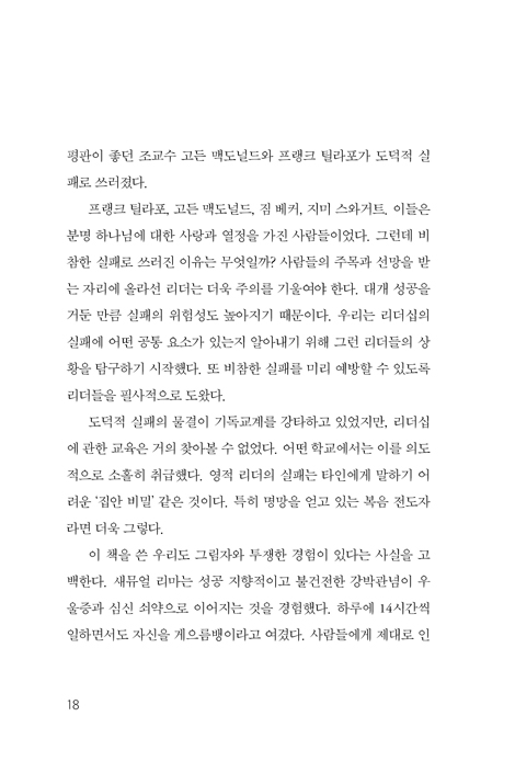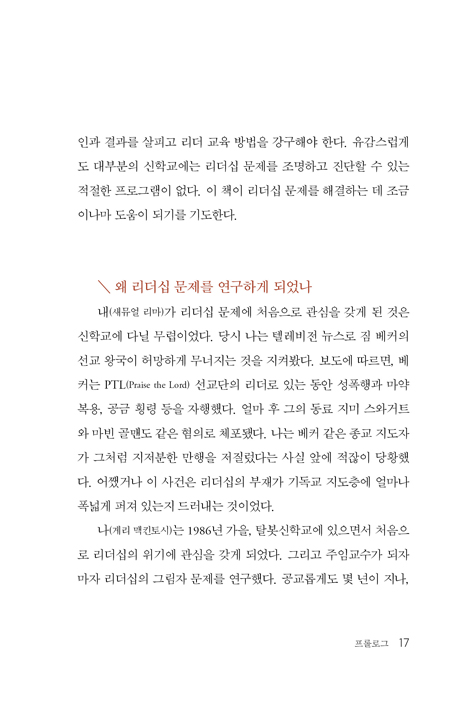 도덕적 실패의 물결이 기독교계를 강타하고 있었지만, 리더십에 관한 교육은 거의 찾아볼 수 없었다. 어떤학교에서는 이를 의도적으로 소홀히 취급했다. 영적 리더의 실패는 타인에게 말하기 어려운 ‘집안 비밀’같은 것이다. 특히 명망을 얻고 있는 복음 전도자라면 더욱 그렇다.이 책을 쓴 우리도 그림자와 투쟁한 경험이 있다는 사실을 고백한다.