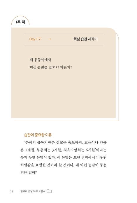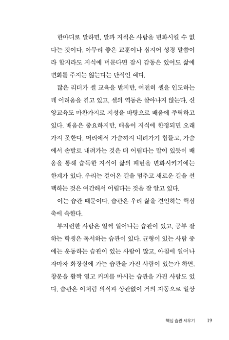 그래서 이 책은 그리스도의 몸인 공동체의 본질을 회복하고 기도와 말씀이 리더의 핵심 습관이 되어 그들의 신앙 뿌리가 깊어지도록 14주간(약 100일)의 훈련 내용을 담았다. 리더가 하나님을 ‘아는 것’과 그렇게 ‘사는 것’이 핵심 습관이 되도록 각 주 차 말미에 매일 큐티와 기도한 것을 기록하는 체크표를 마련했으며, 셀모임에서 서로 나누도록 하였다.