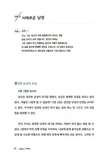 대부분의 남성들은 시간과 바쁜 일정에 쫓겨 인생의 다른 우선순위들을 먼저 처리하다 예수님과의 시간은 언제나 뒷전으로 미루는 경우가 많다. 유감스럽게도 이것은 인생의 우선순위를 정할 때 우리가 저지를 수 있는 최악의 실수다. ‘지혜로운 아버지’는 우리 남성들이 원래의 우선순위를 회복할 수 있도록 도와주는 간결한 안내서다.