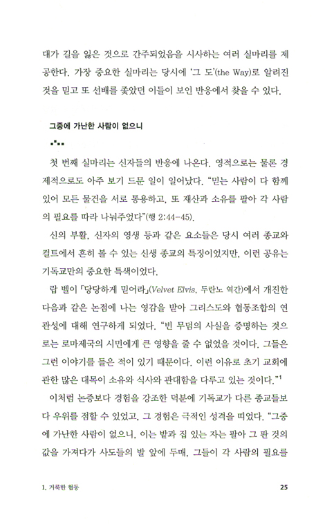 “그렇지만 세상이 갈가리 찢기고 있는 판에 우리끼리 유유상종하는 것을 어떻게 정당화할 수 있을까? 평화를 사랑하고 하나님을 경외하는 사람들이 우리와 다른 방식으로 그 일을 한다고 해서 어떻게 악한 자로 매도할 수 있을까? 예수가 사마리아 마을에서 보낸 시간을 보면, 그들이 다른 종교적 믿음을 갖고 있다는 이유로―혹은 종교적 믿음이 없다는 이유로―우리의 이웃인 그들에게 등을 돌리는 것은 결코 바람직하지 않다. 과연 누가 더 악한 것일까? 교회에 정기적으로 다니지만 평일에는 직원들을 억압하는 사람일까, 그리스도인으로 자처하진 않지만 가난한 자들을 헌신적으로 섬기는 종일까?” 178-179쪽