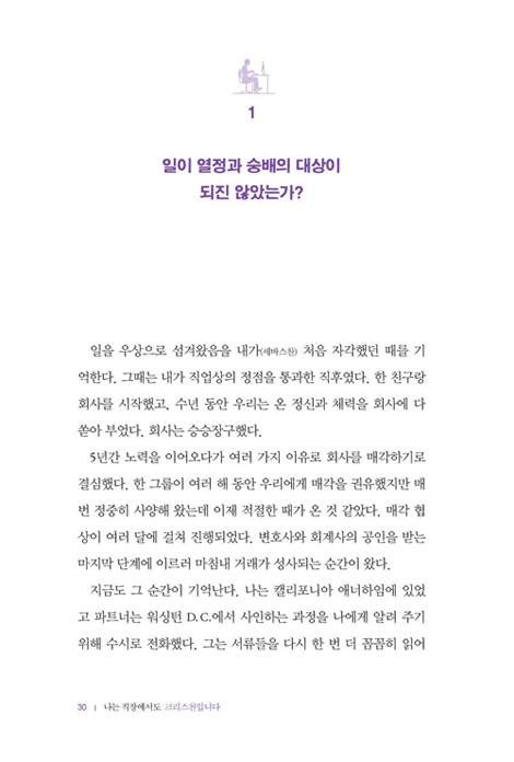 많은 그리스도인이 자신이 하는 일을 신앙과 연관 짓지 못해 괴로워한다. 매일 삶의 현장에서 치열하게 고군분투하지만 이 일이 하나님의 뜻에 맞는 건지, 진정한 삶을 살고 있는 건지 궁금하다. 왠지 교회와 직장의 삶이 이분화된 것 같고 삶의 대부분의 시간을 보내는 직장에서 크리스천으로 살아가는 방법을 잘 모르겠다.