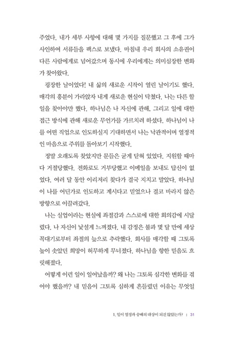 우리의 일을 통해 이루고자 하시는 하나님의 목적을 무시하고서 단지 중요한 것을 얻기 위해 견뎌내야 하는 직업 정도로만 여길 때 우리의 영적인 삶에 끔찍한 불균형이 초래된다. 가정과 교회에서 제자로서의 삶은 튼튼하나, 일터에서 제자로서의 삶은 전혀 그렇지 못하다. _ 2. 생계 수단으로 전락해 마지못해 일하진 않는가?