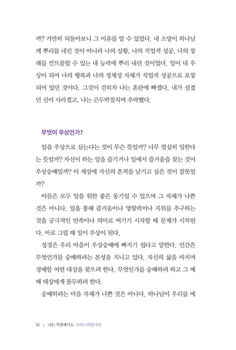 하지만 일을 우상화하는 것은 그저 나쁜 생각이 아니라 영적으로 치명적이다. 만일 우리가 기쁨과 만족, 그리고 어떤 의미를 얻기 위해 ‘자신의 직업과 성취’에 초점을 맞춘다면 그 길의 끝에서 발견하는 건 공허함뿐일 것이다. 우리가 예수 그리스도만을 섬길 때 깊고 지속적인 만족을 발견할 수 있다. _ 1. 일이 열정과 숭배의 대상이 되진 않았는가?