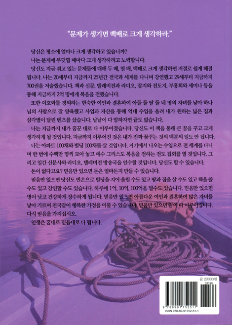 “문제가 생기면 백배로 크게 생각하라. 몸과 마음이 불편해도 일을 시작하고 끝내라. 어떤 일이든 끝을 봐야 성과물이 있다. 해도 해도 안 되면 끝에서부터 시작하라. 그러면 닫혔던 문이 다 열린다.”