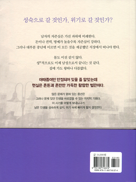 우리나라 중년 남자의 현실은 한마디로 위기 그 자체다. 돈과 권력, 명예를 제공했던 직장에서 떠나야 하고, 노화로 몸은 점점 볼품없어진다. 성(性)적으로도 예전 같지 않다. 게다가 아내도 자녀도 자신을 그저 돈 벌어다 주는 기계 취급하는 것 같다. 열심히 살기만 하면 괜찮을 줄 알았는데, 중년에 이르러 일에서도 가정에서도 힘만 드는 이런 현실은 어디에서 연유했을까? 그리고 그 해결책은 무엇일까? 국내 상담분야의 최고 권위자가 ‘인생을 바로잡을 수 있는 마지막 기회’를 잡는 법을 안내한다.