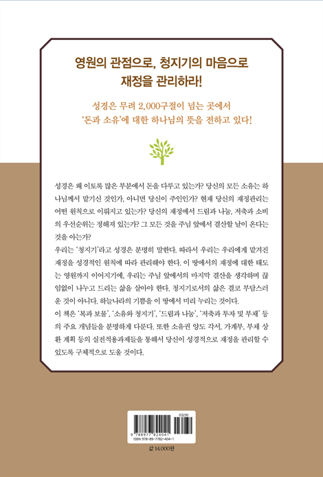 우리의 모든 재정은 하나님의 것이고, 우리는 ‘청지기’일 뿐이라고 성경은 분명히 말한다. 따라서 우리는 우리에게 맡겨진 재정을 철저하게 성경적인 원칙에 따라 관리해야 한다. 이 땅에서의 재정에 대한 태도는 영원까지 이어지기에, 우리는 주님 앞에서의 마지막 결산을 생각하며 끊임없이 나누고 드리는 삶을 살아야 한다는 것이다. 그래서 청지기로서의 삶은 결코 부담스러운 것이 아니라 하늘나라의 기쁨을 이 땅에서 미리 누리는 것임을 저자는 강조한다.