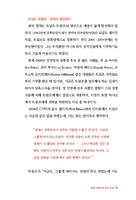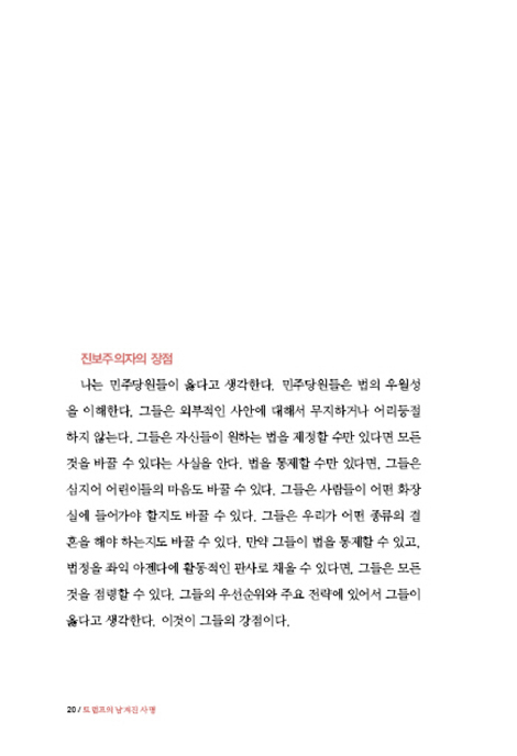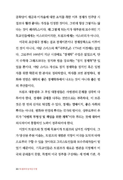 트럼프 대통령과 그 후임 대통령들은 사법권의 문제를 심각히 다루어야 한다. 경제와 규제를 다루는 것만으로는 부족하다. 이 모든 것은 한 번의 선거로 뒤집힐 수 있다. 경제는 열매이지, 좋은 사회의 뿌리는 아니다. 평화와 번영의 뿌리는 국가의 법이다. 상부로부터 우리가 “사법적 투명성 및 책임을 위한 개혁”이라 부르는 것에 대하여 의식적이며 통합적인 노력이 경주되어야 한다. 이것이 트럼프의 첫 번째 목표이자 트럼프의 남겨진 사명이다. p.22