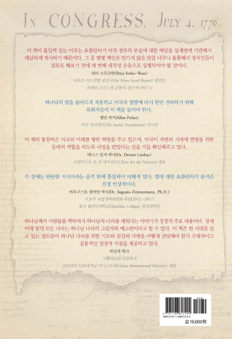 제가 최우선으로 생각하는 주제를 스티브 쵸콜란티가 집어들었다. 쵸콜란티가 제시하는 아이디어와 해결책이 여러분에게 도전을 줄 것이다. 그 만큼 이 책은 매우 기발하고 창의적이며 비전을 제시하는 책이다. 이 책이 흡입력있는 이유는 쵸콜란티가 미국 정부의 부실에 대한 해답을 십계명에 기반해서 대담하게 제시하기 때문이다. 그 중 몇몇 제안은 믿기지 않을 만큼 너무나 훌륭해서 정치인들이 검토도 해보기 전에 세 번째 대각성 운동으로 실행되어야 할 것이다. 저는 예수님께서 세상에 다시 오셔서 바로 세우실 법들이 이 책에 나온 법들과 매우 가깝지 않을까 상상해보았다. 쵸콜란티가 성경에 입각하여 제시한 해결책은 분명 사고 및 행동 전환의 영감을 불어넣어 준다. 미합중국이 국가 존망의 기로에 서서 분투하는 이때에, 많은 아이디어와 풍부한 자료가 담긴 쵸콜란티의 이 책이 매우 긴요하게 쓰일 것이다.