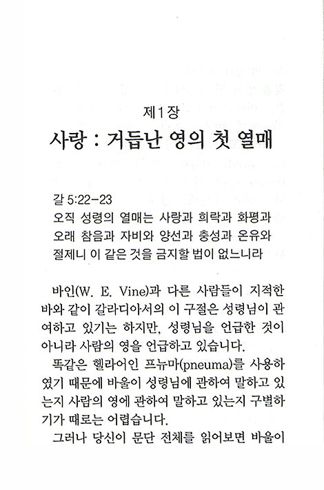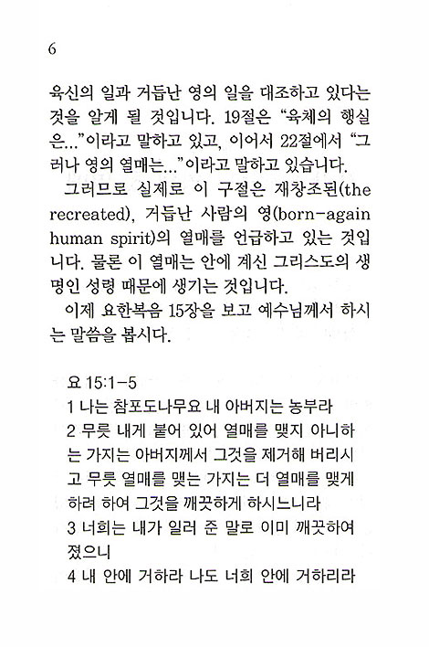 그러나 당신이 문단 전체를 읽으면서 바울이 육신의 일과 거듭난 영의 일을 대조하고 있다는 것을 알게 될 것입니다. 19절은 "육체의 행실은..."이라고 말하고 있고, 이어서 22절에서 "그러나 영의 열매는..." 이라고 말하고 있습니다. 그러므로 실제로 이 구절은 재창조된(the recreated), 거듭난 사람의 영(born-again human spirit)의 열매를 언급하고 있는 것입니다. 물론 이 열매는 안에 계신 그리스도의 생명인 성령 때문에 생기는 것입니다.