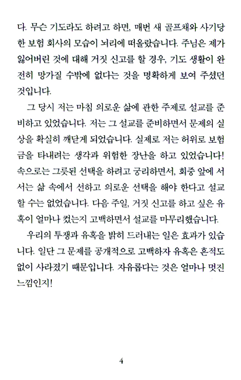 “당신이 쉽게 빠지는 유혹 배후에 있는 깊은 욕구를 보여 주시도록 기도하십시오. 때로 우리는 유혹이 심층적인 문제의 증상에 불과하다는 것을 이해하지 못한 채 문제들을 다루려고 합니다. 하나님은 당신이 스스로를 좀더 깊이 알고 이해하도록 인도하실 수 있는 분이며 또한 그렇게 하실 것입니다. 자신에 대한 자각과 이해는 실제적인 필요를 충족시킬 수 있는 합리적이고 건전한 방법을 발견하도록 도와줍니다.”