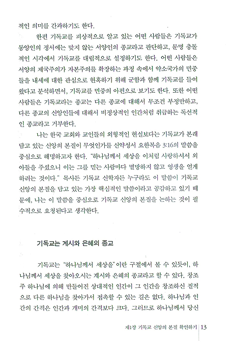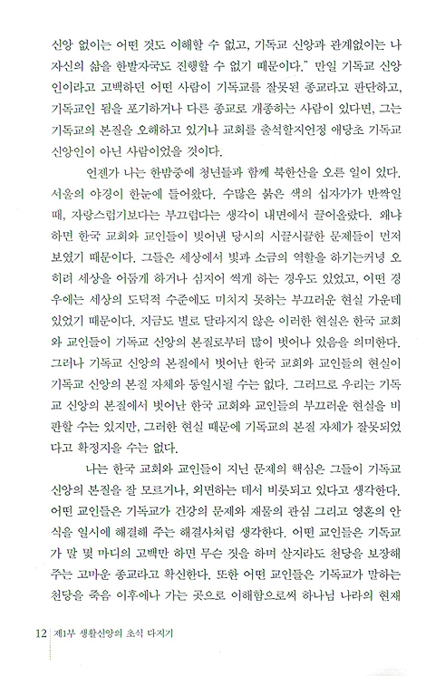 오늘의 한국교회는 기독교 교리에 대한 근본주의적인 승인은 있지만 삶이 따르지 않는 신앙, 지금 여기에서 어떤 능력도 어떤 의미도 드러내지 못하고 그저 내세의 영역으로 유보되고 있는 신앙, 그래서 일반인들로부터 손가락질을 당할 수밖에 없는 부끄러운 신앙의 틀 속에 함몰되어 있다. 대부분의 교인들에게 신앙생활이란 것은 많은 생활 영역들 가운데 추가된 다른 하나의 생활 영역처럼 취급되고 있다. 그러나 진정한 의미의 기독교 신앙은 생활신앙이다.
