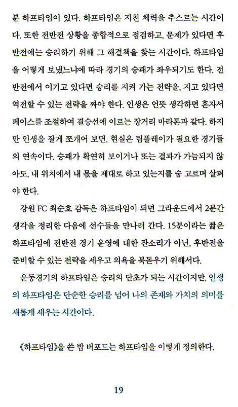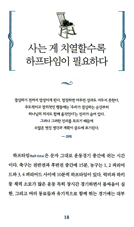 스포츠 경기에서 대부분 승패는 후반전에서 결정된다. 인생 또한 마찬가지다. 하프타임이 중요한 이유는 인생의 반환점에서 어떤 마음 자세로 삶의 가치를 재설계하고 방향을 잡아가느냐에 따라 삶 전체가 달라지기 때문이다.