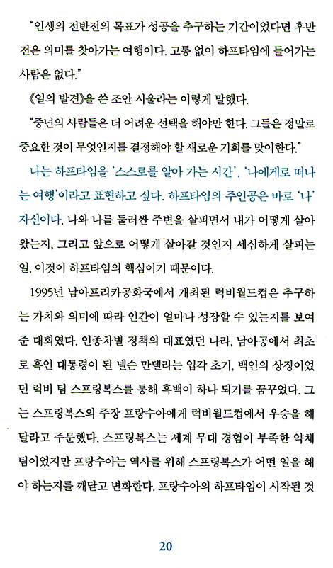 작전타임인 하프타임을 어떻게 보내느냐에 따라 인생 후반기가 달라진다. 인생 전반기가 나의 선택이 아닌 주변의 바람과 세상이 원하는 성공에 맞춘 삶이었다면 후반은 좀더 '의미'와 '성숙'의 삶을 살 수 있지 않을까?