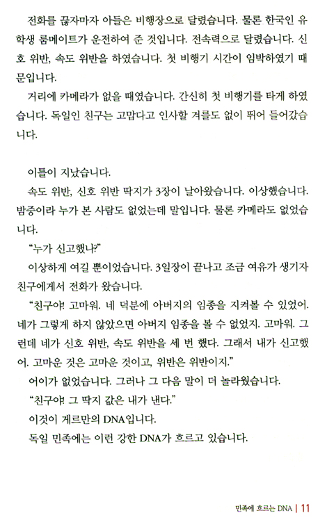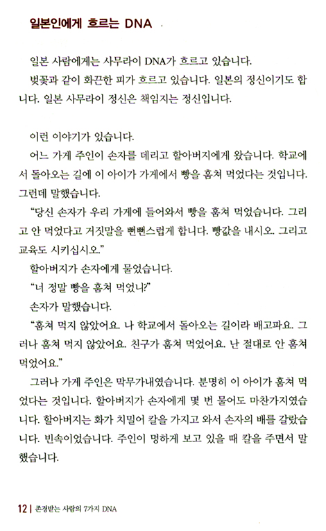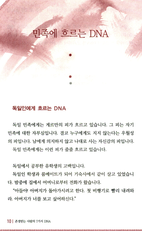 사람은 누구나 존경받는 삶을 살기를 원한다. 저자는 이 책에서 존경받는 사람에게는 존경받을 만한 DNA가 흐르고 있는데, 무소유, 유머, 집착, 역발상, 말, 구제, 노을 성격, 7가지로 이야기하고 있다. 가문과 민족에 면면히 흐르고 있는 DNA의 영향을 여러 가지 예화를 통해 증명하면서 좋은 DNA의 중요성을 강조하고 있다. 어떻게 해야 사람들에게 감동을 주고 존경받는 사람이 될 수 있는가? 그 해답이 바로 이 책에 있다. 존경받는 사람의 7가지 DNA를 찾아 떠나는 영성여행은 독자들에게 자기 자신을 변화시키고 성공적인 삶에 대한 새로운 도전을 불러일으켜 준다.