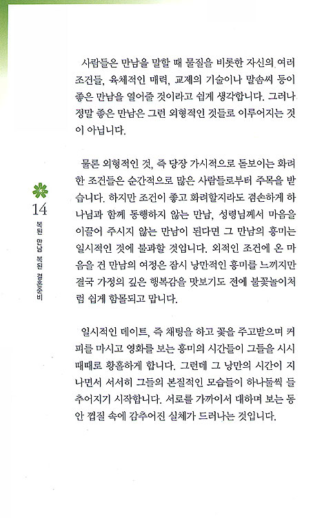 이 책은 결혼준비 여정의 어려움을 겪고 있는 사람들에게 작은 희망을 드리고자 결혼준비 과정을 핵심적으로 축약하여 제시한 것입니다. 하나님께서 여러분에게 은혜를 베푸실 것을 기대합니다. 그분은, 우리가 걷는 결혼준비 여정에 동행하길 원하십니다. 우리의 실수를 줄여주시고 부족을 채워 주시길 원하십니다. 우리를 상처와 외로움 가운데 버려두시는 분이 아닙니다. 오히려 더 좋은 초장의 자리를 예비하시고, 자신은 거친 들판에서 비바람을 맞으며 기도해 주시는 분입니다. 그분은 늘 침묵하시는 것처럼 보여도 실상은 우리 곁에 다가오셔서 늘 사랑의 눈빛으로 주목하고 계십니다. 특별히 결혼준비 여정 가운데 가까이 다가오셔서 한 걸음씩 섬세하게 인도하시길 원하십니다.