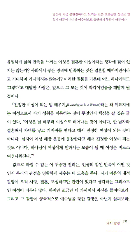 이 책은 결혼에 대해 꿈꾸고 있는 여성들에게는 더 바랄 것이 없을 정도로 좋은 책이다. 결혼은 행복한 여정이지만 결혼이 내 인생을 완성시켜 주는 것이 아니라 주님이 내 인생을 완성시켜 주시는 것이다. 싱글일 때 행복할 수 없는 사람은 결혼해서도 행복하리라는 보장이 없다. 당신은 지금 행복한가? 이 책은 여성의 과거를 치유해 주고 현재를 건강하게 해주며 미래를 행복하게 해줄 보물 같은 책이다.